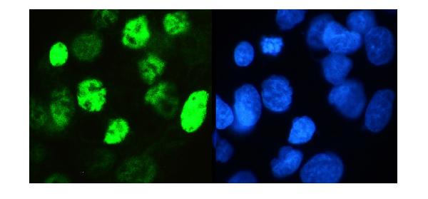 ICC/IF analysis of HNF-4-alpha using anti- HNF-4-alpha antibody (PB9215).HNF-4-alpha was detected in immunocytochemical section of HEPG2 cell. Enzyme antigen retrieval was performed using IHC enzyme antigen retrieval reagent (AR0022) for 15 mins. The cells were blocked with 10% goat serum. And then incubated with 2μg/mL rabbit anti- HNF-4-alpha Antibody (PB9215) overnight at 4°C. Fluoro488 Conjugated Goat Anti-Rabbit IgG (BA1127) was used as secondary antibody at 1:100 dilution and incubated for 30 minutes at 37°C. The section was counterstained with DAPI. Visualize using a fluorescence microscope and filter sets appropriate for the label used.