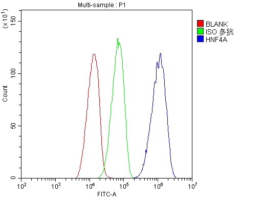 Flow Cytometry analysis of HEPG2 cells using anti- HNF-4-alpha antibody (PB9215).Overlay histogram showing HEPG2 cells stained with PB9215 (Blue line).The cells were blocked with 10% normal goat serum. And then incubated with rabbit anti-HNF-4-alpha Antibody (PB9215, 1:100) for 30 min at 20°C. Fluoro488 conjugated goat anti-rabbit IgG (BA1127, 1:100) was used as secondary antibody for 30 minutes at 20°C. Isotype control antibody (Green line) was rabbit IgG (1:100) used under the same conditions. Unlabelled sample (Red line) was also used as a control.