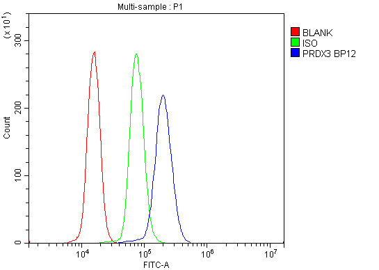 Overlay histogram showing U937 cells stained with PB9349 (Blue line). To facilitate intracellular staining, cells were fixed with 4% paraformaldehyde and permeabilized with permeabilization buffer. The cells were blocked with 10% normal goat serum. And then incubated with rabbit anti-PRDX3 Antibody (PB9349) at 1:100 dilution for 30 min at 20°C. Fluoro488 conjugated goat anti-rabbit IgG (BA1127) was used as secondary antibody at 1:100 dilution for 30 minutes at 20°C. Isotype control antibody (Green line) was rabbit IgG at 1:100 dilution used under the same conditions. Unlabelled sample without incubation with primary antibody and secondary antibody (Red line) was used as a blank control.
