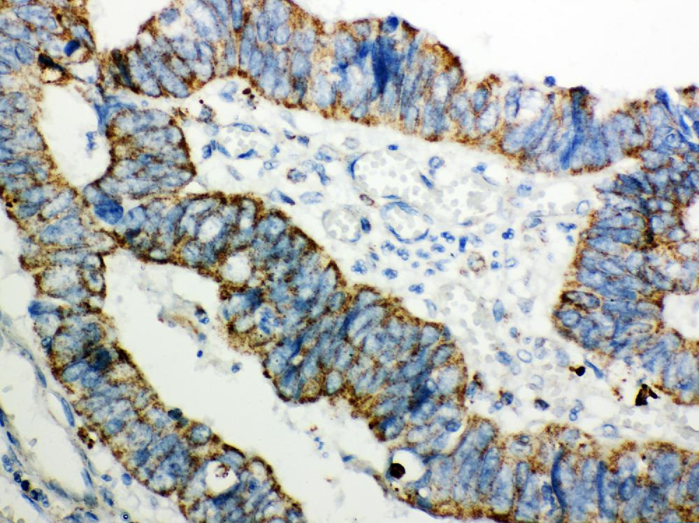 PRDX3 was detected in a paraffin-embedded section of human intestinal cancer tissue. Biotinylated goat anti-rabbit IgG was used as secondary antibody. The tissue section was incubated with rabbit anti-PRDX3 Antibody (PB9349) at a dilution of 1:200 and developed using Strepavidin-Biotin-Complex (SABC) (Catalog # SA1022) with DAB (Catalog # AR1027) as the chromogen.