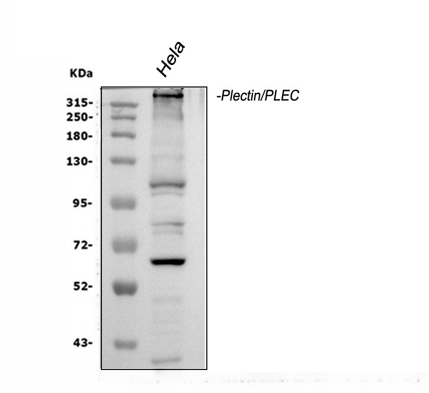 Use rabbit anti- PLEC 1:1000, probed with a goat anti-rabbit IgG-HRP secondary antibody. The signal is developed using an Enhanced Chemiluminescent detection (ECL) kit (Catalog#EK1002). A specific band was detected for PLEC at approximately 532KD. The expected band size for PLEC is at 532KD.