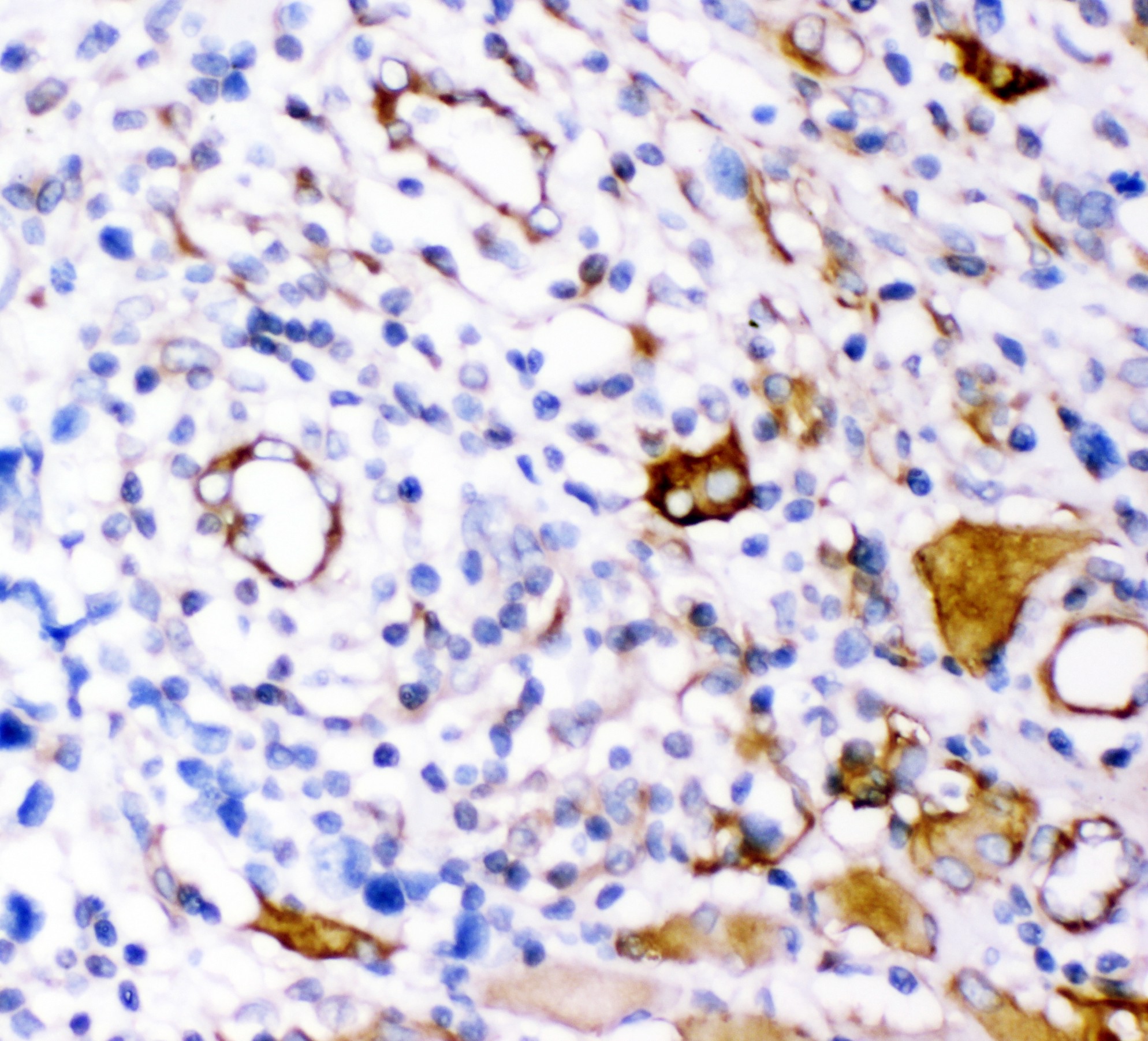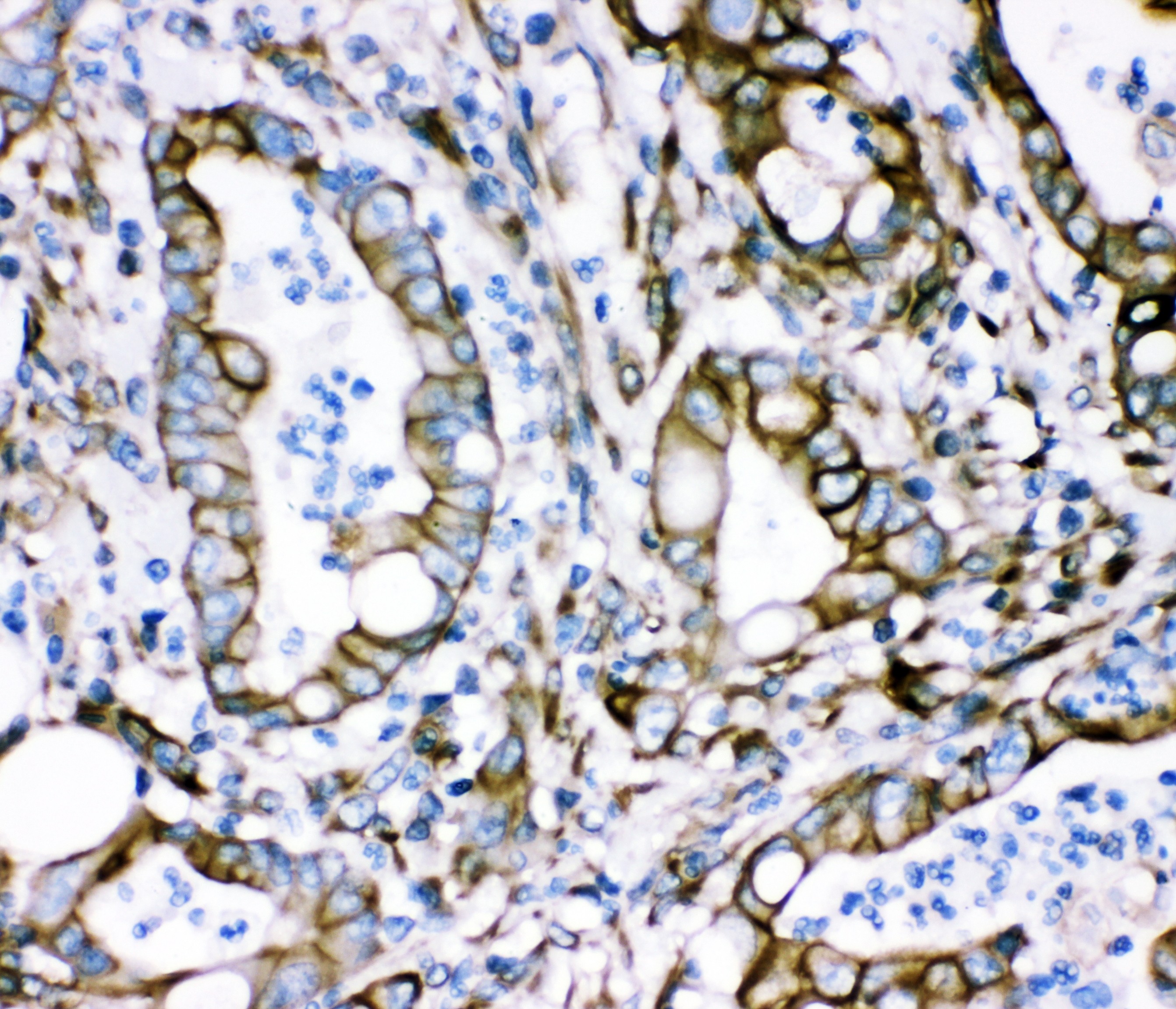 Plectin/PLEC was detected in a paraffin-embedded section of human lung cancer tissue. The tissue section was incubated with rabbit anti-Plectin/PLEC Antibody (PB9430) at a dilution of 1:200 and developed using HRP Conjugated Rabbit IgG Super Vision Assay Kit (Catalog # SV0002) with DAB (Catalog # AR1027) as the chromogen.