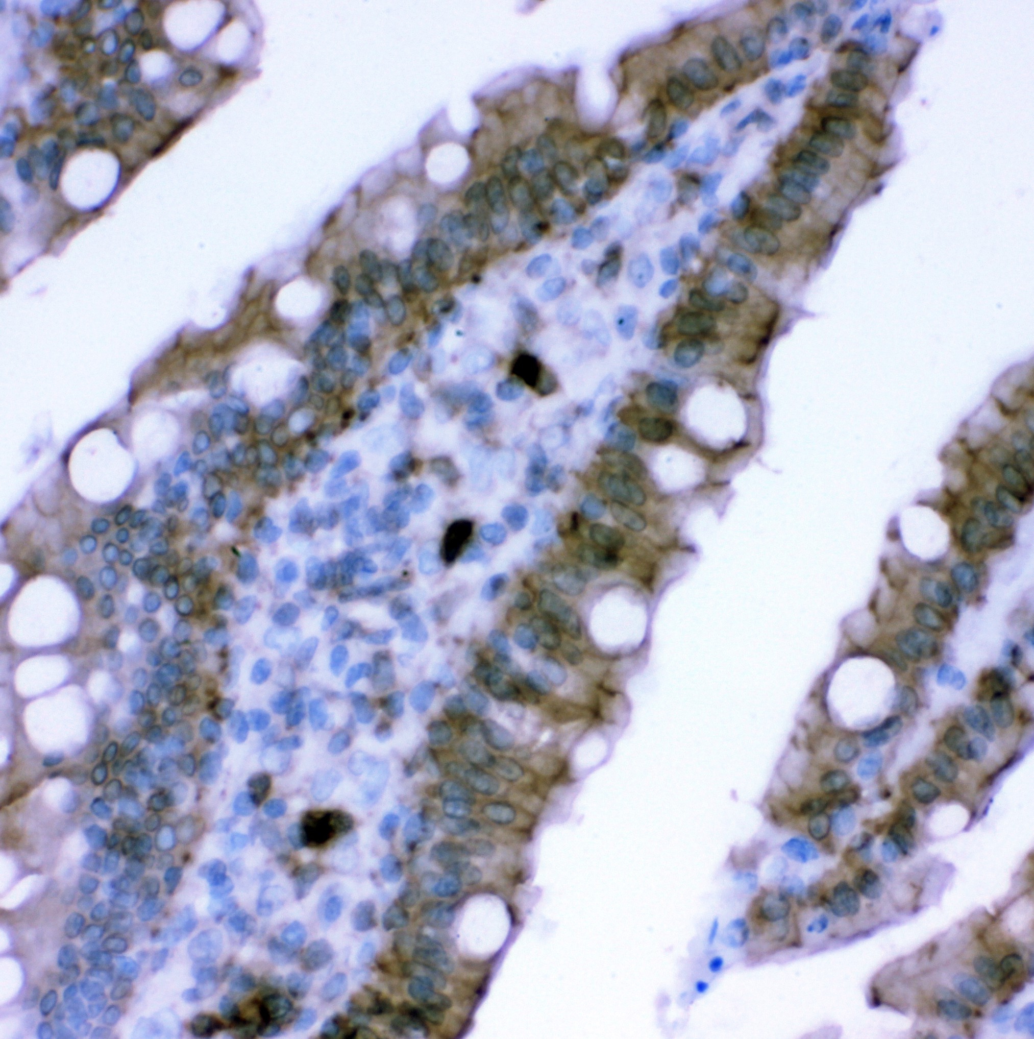 Plectin/PLEC was detected in a paraffin-embedded section of mouse intestine tissue. The tissue section was incubated with rabbit anti-Plectin/PLEC Antibody (PB9430) at a dilution of 1:200 and developed using HRP Conjugated Rabbit IgG Super Vision Assay Kit (Catalog # SV0002) with DAB (Catalog # AR1027) as the chromogen.