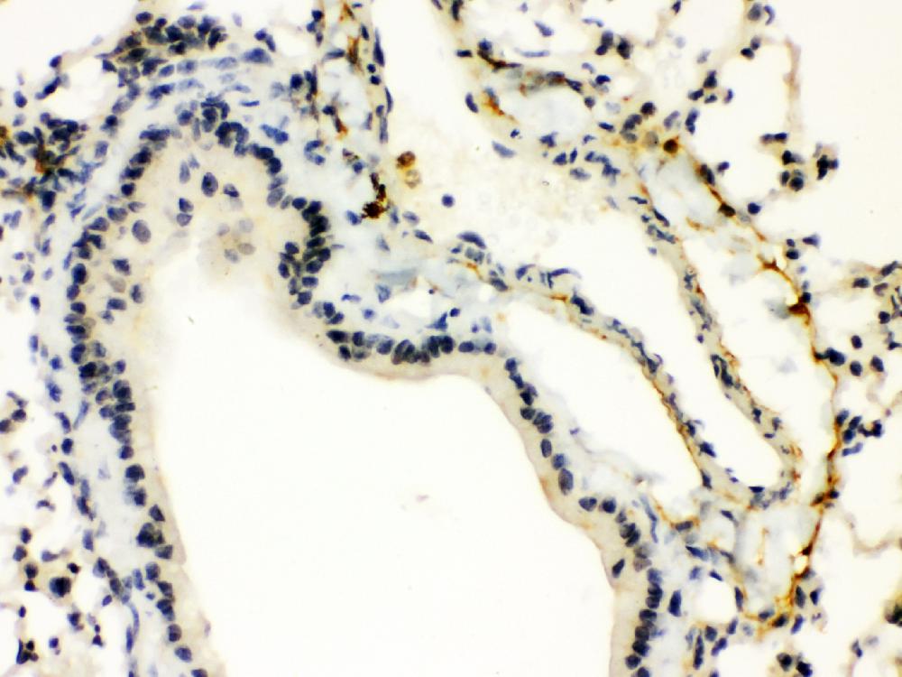 XBP1 was detected in a paraffin-embedded section of rat lung tissue. Biotinylated goat anti-rabbit IgG was used as secondary antibody. The tissue section was incubated with rabbit anti-XBP1 Antibody (PB9463) at a dilution of 1:200 and developed using Strepavidin-Biotin-Complex (SABC) (Catalog # SA1022) with DAB (Catalog # AR1027) as the chromogen.