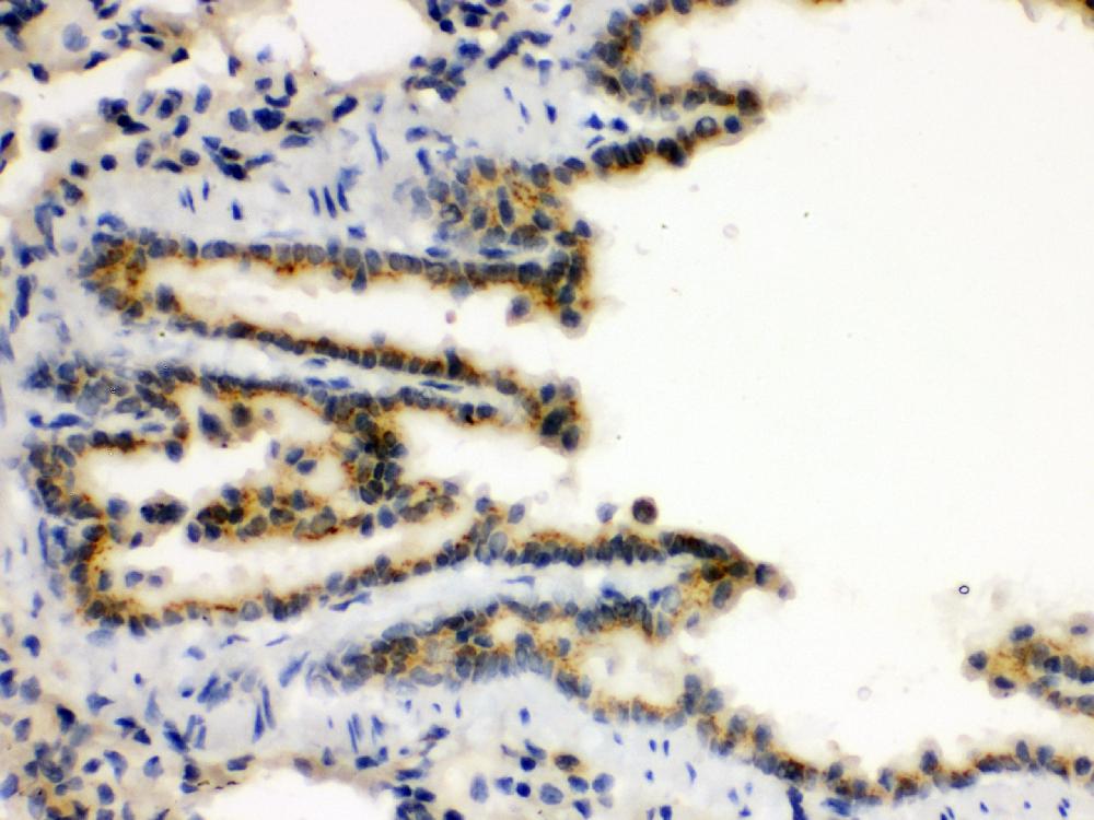 XBP1 was detected in a paraffin-embedded section of mouse lung tissue. Biotinylated goat anti-rabbit IgG was used as secondary antibody. The tissue section was incubated with rabbit anti-XBP1 Antibody (PB9463) at a dilution of 1:200 and developed using Strepavidin-Biotin-Complex (SABC) (Catalog # SA1022) with DAB (Catalog # AR1027) as the chromogen.