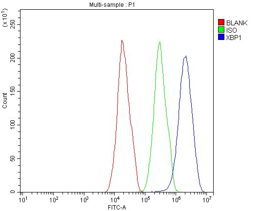Overlay histogram showing HepG2 cells stained with PB9463 (Blue line). To facilitate intracellular staining, cells were fixed with 4% paraformaldehyde and permeabilized with permeabilization buffer. The cells were blocked with 10% normal goat serum. And then incubated with rabbit anti-XBP1 Antibody (PB9463) at 1:100 dilution for 30 min at 20°C. Fluoro488 conjugated goat anti-rabbit IgG (BA1127) was used as secondary antibody at 1:100 dilution for 30 minutes at 20°C. Isotype control antibody (Green line) was rabbit IgG at 1:100 dilution used under the same conditions. Unlabelled sample without incubation with primary antibody and secondary antibody (Red line) was used as a blank control.