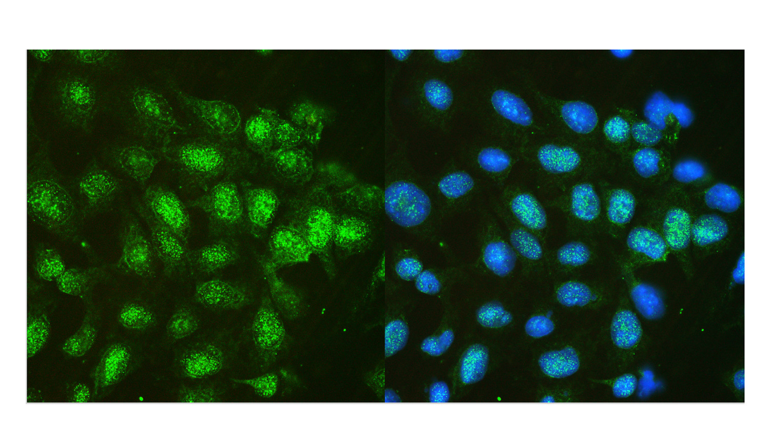 ICC/IF analysis of XBP1 using anti-XBP1 antibody (PB9463). XBP1 was detected in immunocytochemical section of U2OS cells. Enzyme antigen retrieval was performed using IHC enzyme antigen retrieval reagent (AR0022) rabbit anti-XBP1 Antibody (PB9463). Fluoro 488 Conjugated Goat Anti-Rabbit IgG (BA1127) was used as secondary antibody. The section was counterstained with DAPI. Visualize using a fluorescence microscope and filter sets appropriate for the label used.