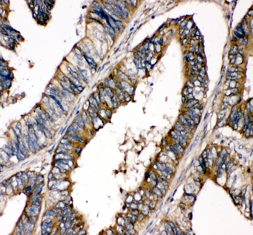 SHP2/PTPN11 was detected in a paraffin-embedded section of human colon cancer tissue. The tissue section was incubated with rabbit anti-SHP2/PTPN11 Antibody (PB9675) at a dilution of 1:200 and developed using HRP Conjugated Rabbit IgG Super Vision Assay Kit (Catalog # SV0002) with DAB (Catalog # AR1027) as the chromogen.