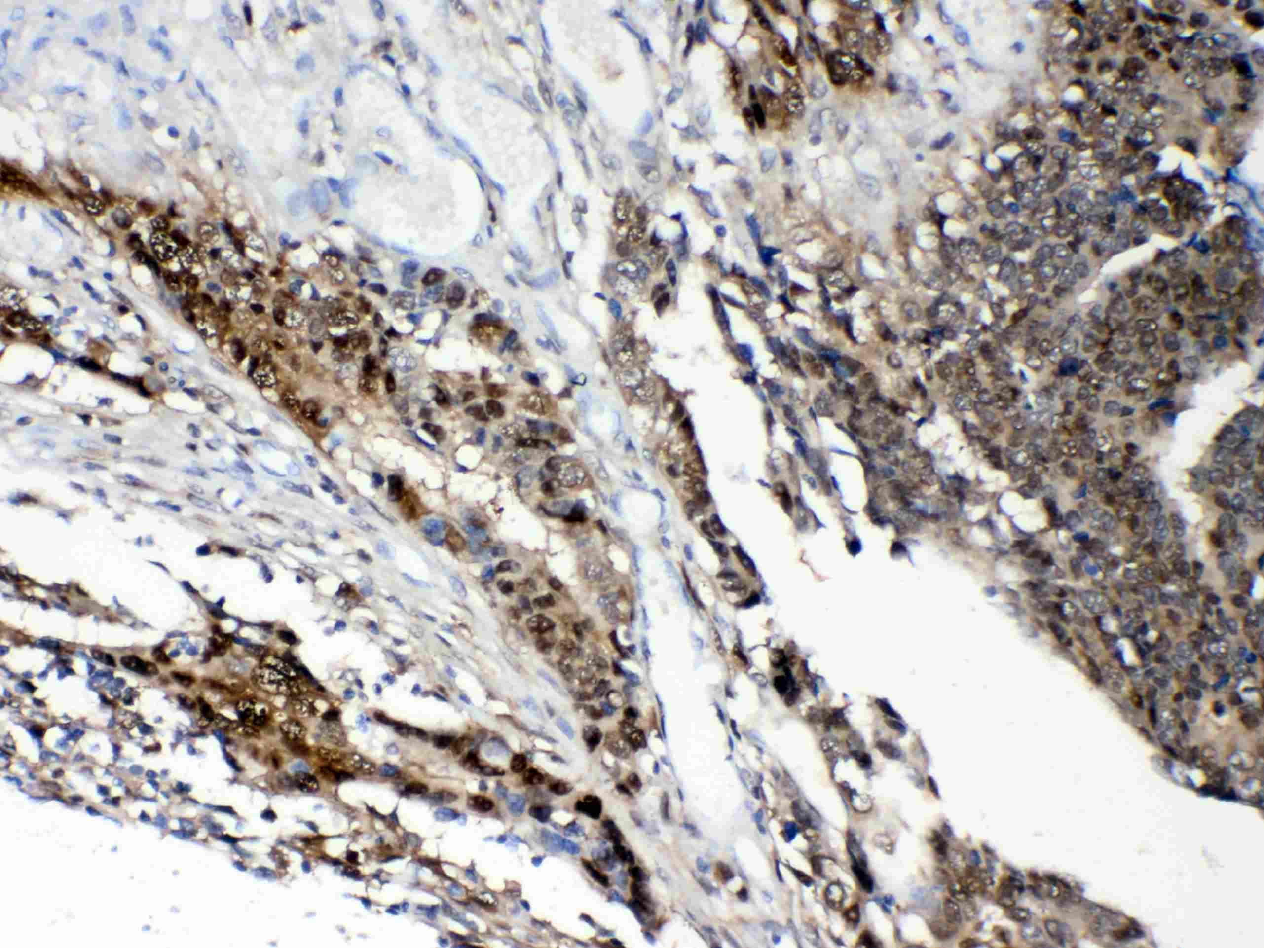 STAT1 was detected in a paraffin-embedded section of human intestinal cancer tissue. Biotinylated goat anti-rabbit IgG was used as secondary antibody. The tissue section was incubated with rabbit anti-STAT1 Antibody (A00036-2) at a dilution of 1:200 and developed using Strepavidin-Biotin-Complex (SABC) (Catalog # SA1022) with DAB (Catalog # AR1027) as the chromogen.