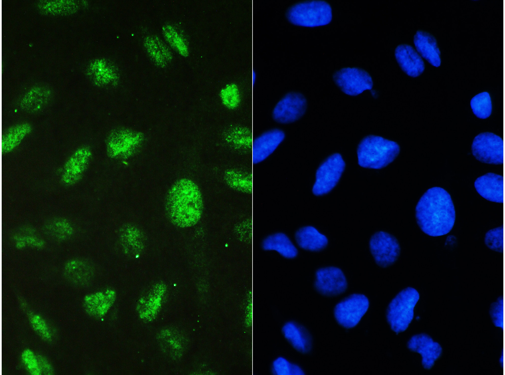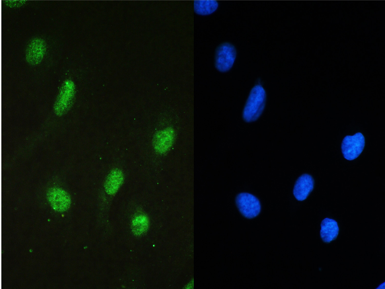 ICC/IF analysis of STAT1 using anti- STAT1 antibody (A00036-2) STAT1 was detected in immunocytochemical section of U20S cell. Enzyme antigen retrieval was performed using IHC enzyme antigen retrieval reagent (AR0022) for 15 mins. The tissue section was blocked with 10% goat serum. The tissue section was then incubated with 2μg/mL rabbit . Fluoro488 Conjugated Goat Anti-Rabbit IgG (BA1127) was used as secondary antibody at 1:100 dilution The section was counterstained with DAPI. Visualize using a fluorescence microscope and filter sets appropriate for the label used.