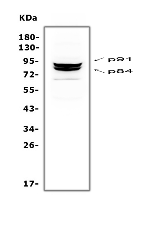After electrophoresis, proteins were transferred to a membrane. Then the membrane was incubated with rabbit anti-STAT1 antigen affinity purified polyclonal antibody (A00036-2) at a dilution of 1:1000 and probed with a goat anti-rabbit IgG-HRP secondary antibody (Catalog # BA1054). The signal is developed using ECL Plus Western Blotting Substrate (Catalog # AR1197). A specific band was detected for STAT1 at approximately 91 kDa. The expected band size for STAT1 is at 87 kDa.