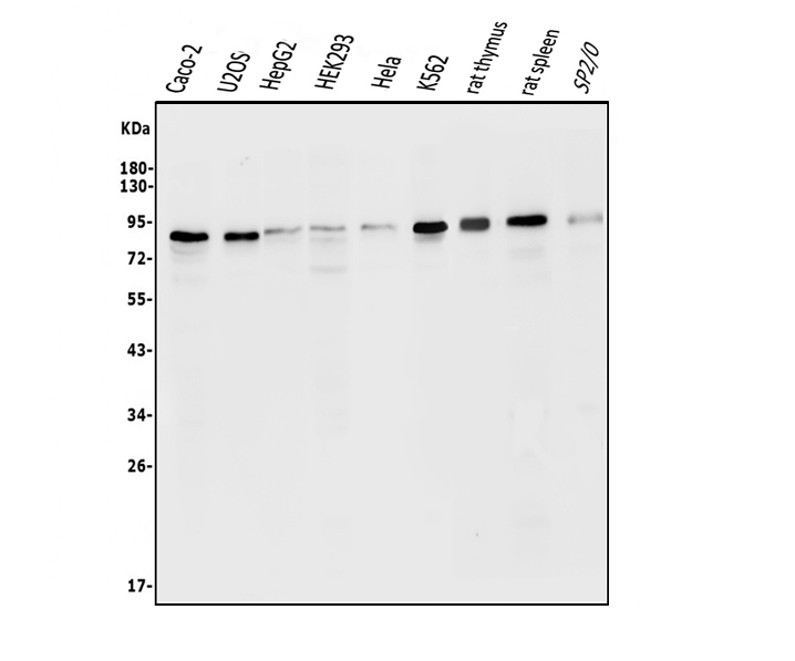 Lane 9: Mouse SP2/0 whole cell lysates.