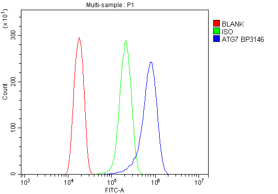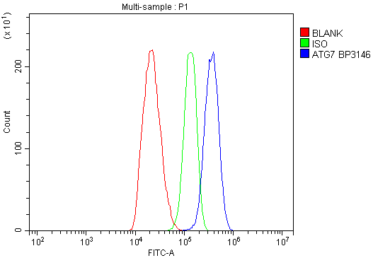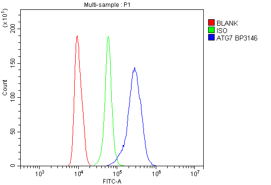 Overlay histogram showing Hela cells stained with A00346 (Blue line). To facilitate intracellular staining, cells were fixed with 4% paraformaldehyde and permeabilized with permeabilization buffer. The cells were blocked with 10% normal goat serum. And then incubated with rabbit anti-ATG7 Antibody (A00346) at 1:100 dilution for 30 min at 20°C. Fluoro488 conjugated goat anti-rabbit IgG (BA1127) was used as secondary antibody at 1:100 dilution for 30 minutes at 20°C. Isotype control antibody (Green line) was rabbit IgG at 1:100 dilution used under the same conditions. Unlabelled sample without incubation with primary antibody and secondary antibody (Red line) was used as a blank control.