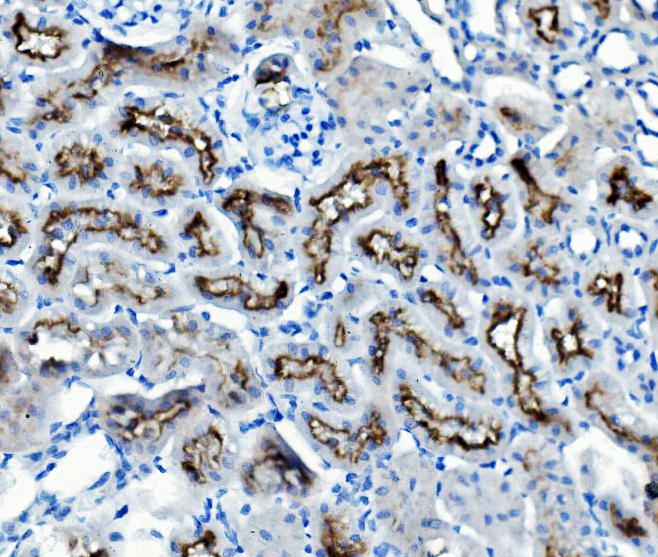 ATG7 was detected in a paraffin-embedded section of mouse kidney tissue. Biotinylated goat anti-rabbit IgG was used as secondary antibody. The tissue section was incubated with rabbit anti-ATG7 Antibody (A00346) at a dilution of 1:200 and developed using Strepavidin-Biotin-Complex (SABC) (Catalog # SA1022) with DAB (Catalog # AR1027) as the chromogen.