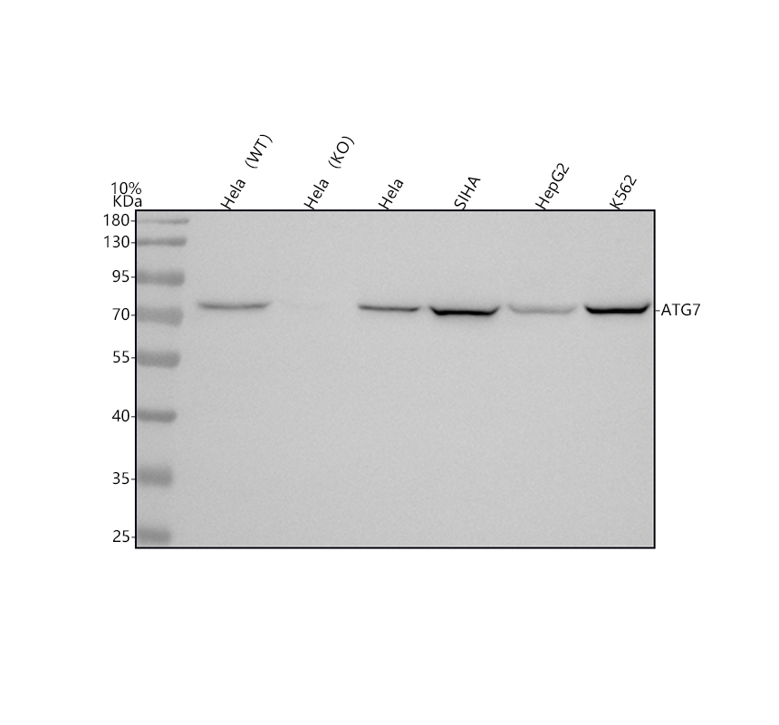 Western blot analysis of ATG7 using anti-ATG7 antibody (A00346). The sample well of each lane was loaded with 30 ug of sample under reducing conditions.