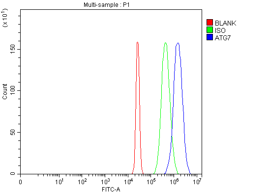 Overlay histogram showing HepG2 cells stained with A00346-5 (Blue line). To facilitate intracellular staining, cells were fixed with 4% paraformaldehyde and permeabilized with permeabilization buffer. The cells were blocked with 10% normal goat serum. And then incubated with rabbit anti-ATG7 Antibody (A00346-5, 1:100). Fluoro488 conjugated goat anti-rabbit IgG (BA1127, 1:100) was used as secondary antibody. Isotype control antibody (Green line) was rabbit IgG (Catalog # BA1045) (1:100) used under the same conditions. Unlabelled sample (Red line) was also used as a control.
