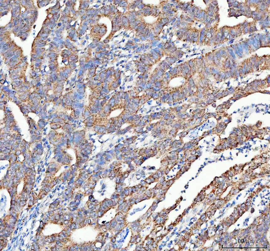 ATG7 was detected in a paraffin-embedded section of human colorectal adenocarcinoma tissue. The tissue section was developed using HRP Conjugated Rabbit IgG Super Vision Assay Kit (Catalog # SV0002) with DAB (Catalog # AR1027) as the chromogen.