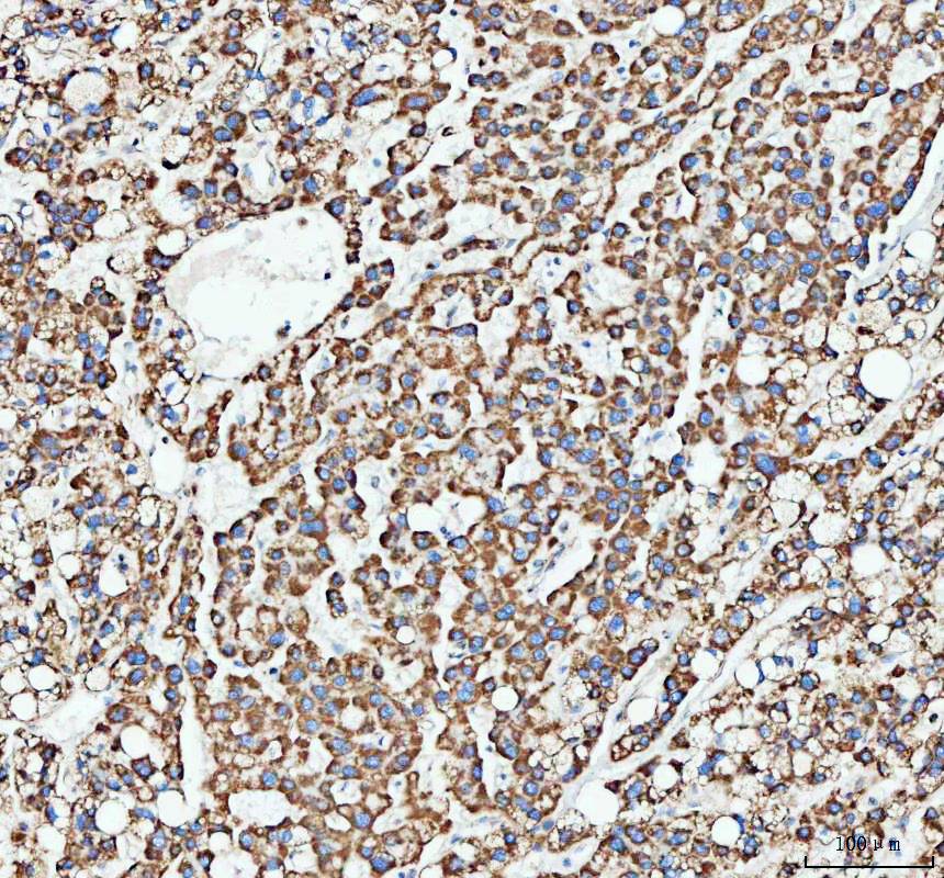 ATG7 was detected in a paraffin-embedded section of human liver cancer tissue. The tissue section was developed using HRP Conjugated Rabbit IgG Super Vision Assay Kit (Catalog # SV0002) with DAB (Catalog # AR1027) as the chromogen.