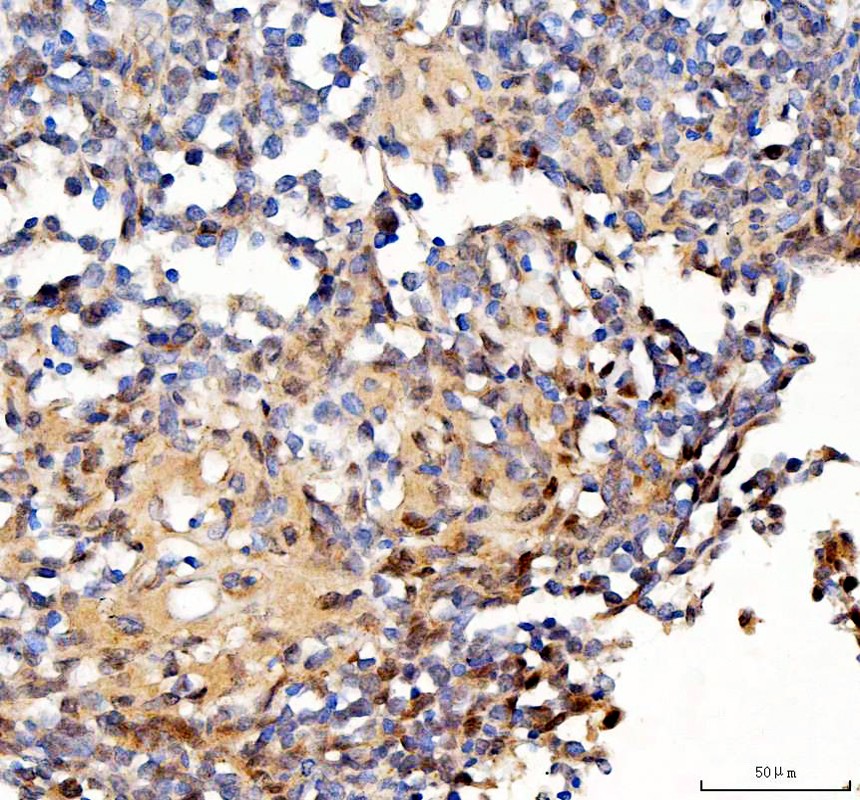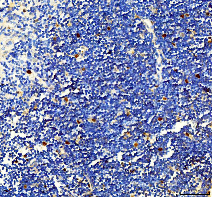 Survivin/BIRC5 was detected in a paraffin-embedded section of human lymphoma tissue. The tissue section was incubated with rabbit anti-Survivin/BIRC5 Antibody (A00379) at a dilution of 1:200 and developed using HRP Conjugated Rabbit IgG Super Vision Assay Kit (Catalog # SV0002) with DAB (Catalog # AR1027) as the chromogen.