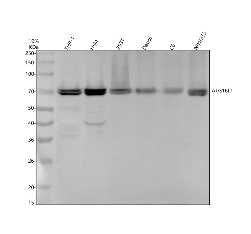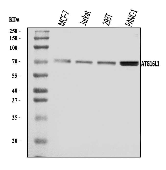 After electrophoresis, proteins were transferred to a membrane. Then the membrane was incubated with rabbit anti-ATG16L1 antigen affinity purified polyclonal antibody (A00526-3) at a dilution of 1:1000 and probed with a goat anti-rabbit IgG-HRP secondary antibody (Catalog # BA1054). The signal is developed using ECL Plus Western Blotting Substrate (Catalog # AR1197). A specific band was detected for ATG16L1 at approximately 68 kDa. The expected band size for ATG16L1 is at 68 kDa.