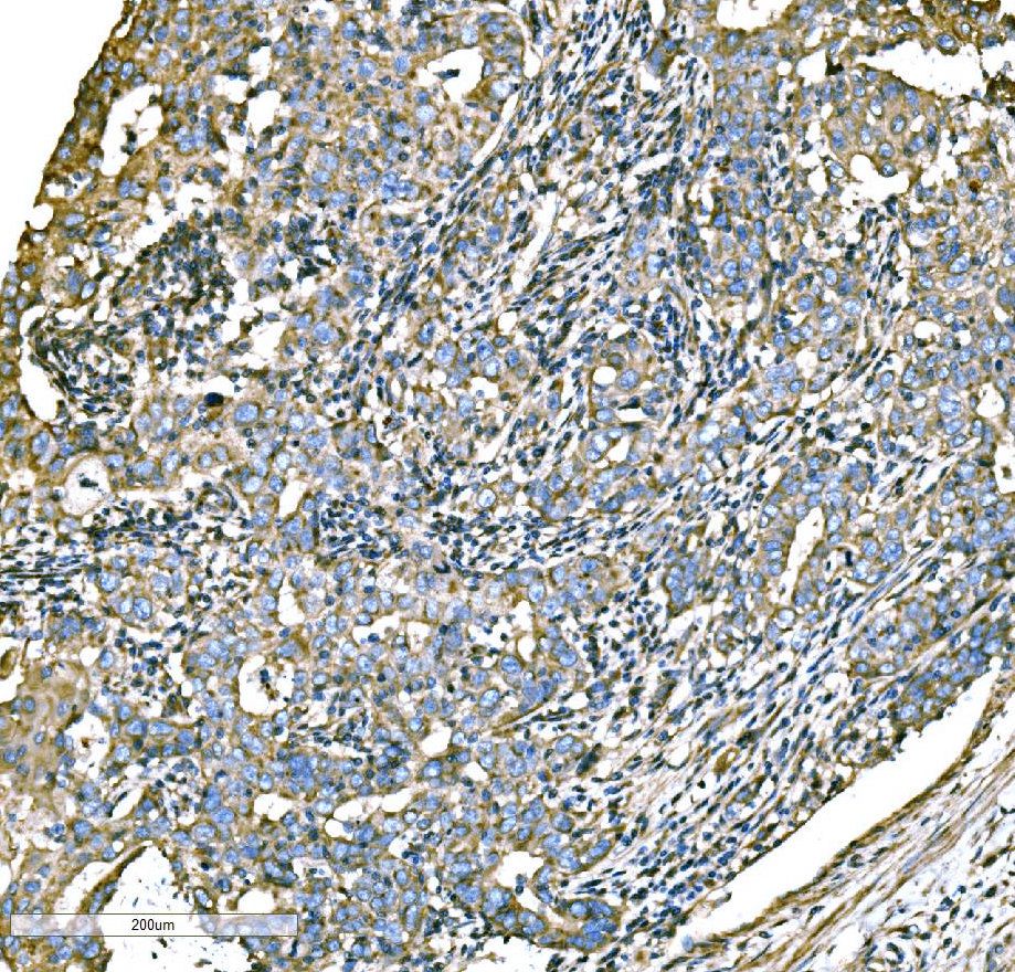 ATG16L1 was detected in a paraffin-embedded section of human esophageal squamous carcinoma tissue. Biotinylated goat anti-rabbit IgG was used as secondary antibody. The tissue section was incubated with rabbit anti-ATG16L1 Antibody (A00526-3) at a dilution of 1:200 and developed using Strepavidin-Biotin-Complex (SABC) (Catalog # SA1022) with DAB (Catalog # AR1027) as the chromogen.