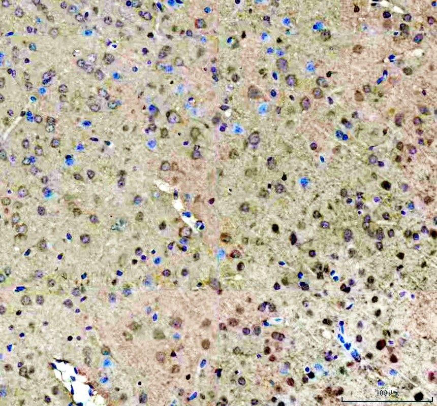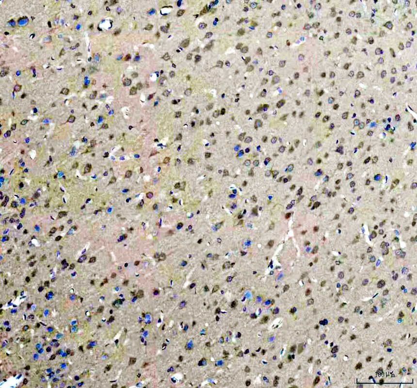 ROCK1 was detected in a paraffin-embedded section of mouse brain tissue. The tissue section was incubated with rabbit anti-ROCK1 Antibody (A00722-5) at a dilution of 1:200 and developed using HRP Conjugated Rabbit IgG Super Vision Assay Kit (Catalog # SV0002) with DAB (Catalog # AR1027) as the chromogen.
