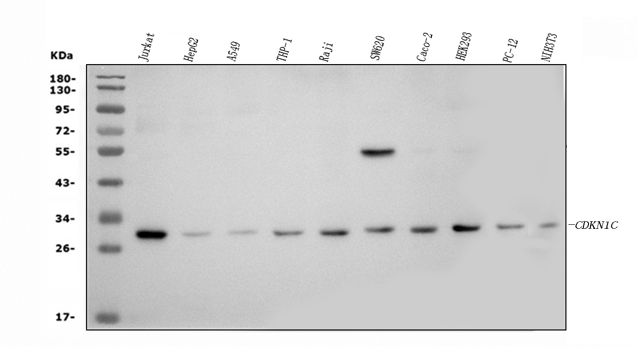 Western blot analysis of p57Kip2/CDKN1C using anti-p57Kip2/CDKN1C antibody (A01244-2). The sample well of each lane was loaded with 30 ug of sample under reducing conditions.