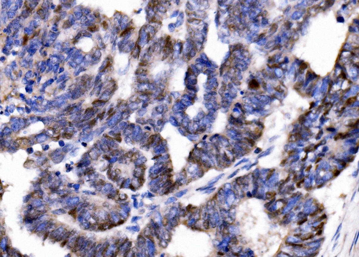 p57Kip2/CDKN1C was detected in a paraffin-embedded section of human cervical cancer tissue. Biotinylated goat anti-rabbit IgG was used as secondary antibody. The tissue section was incubated with rabbit anti-p57Kip2/CDKN1C Antibody (A01244-2) at a dilution of 1:200 and developed using Strepavidin-Biotin-Complex (SABC) (Catalog # SA1022) with DAB (Catalog # AR1027) as the chromogen.