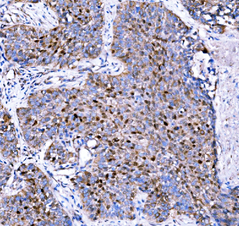 p57Kip2/CDKN1C was detected in a paraffin-embedded section of human lung cancer tissue. Biotinylated goat anti-rabbit IgG was used as secondary antibody. The tissue section was incubated with rabbit anti-p57Kip2/CDKN1C Antibody (A01244-2) at a dilution of 1:200 and developed using Strepavidin-Biotin-Complex (SABC) (Catalog # SA1022) with DAB (Catalog # AR1027) as the chromogen.