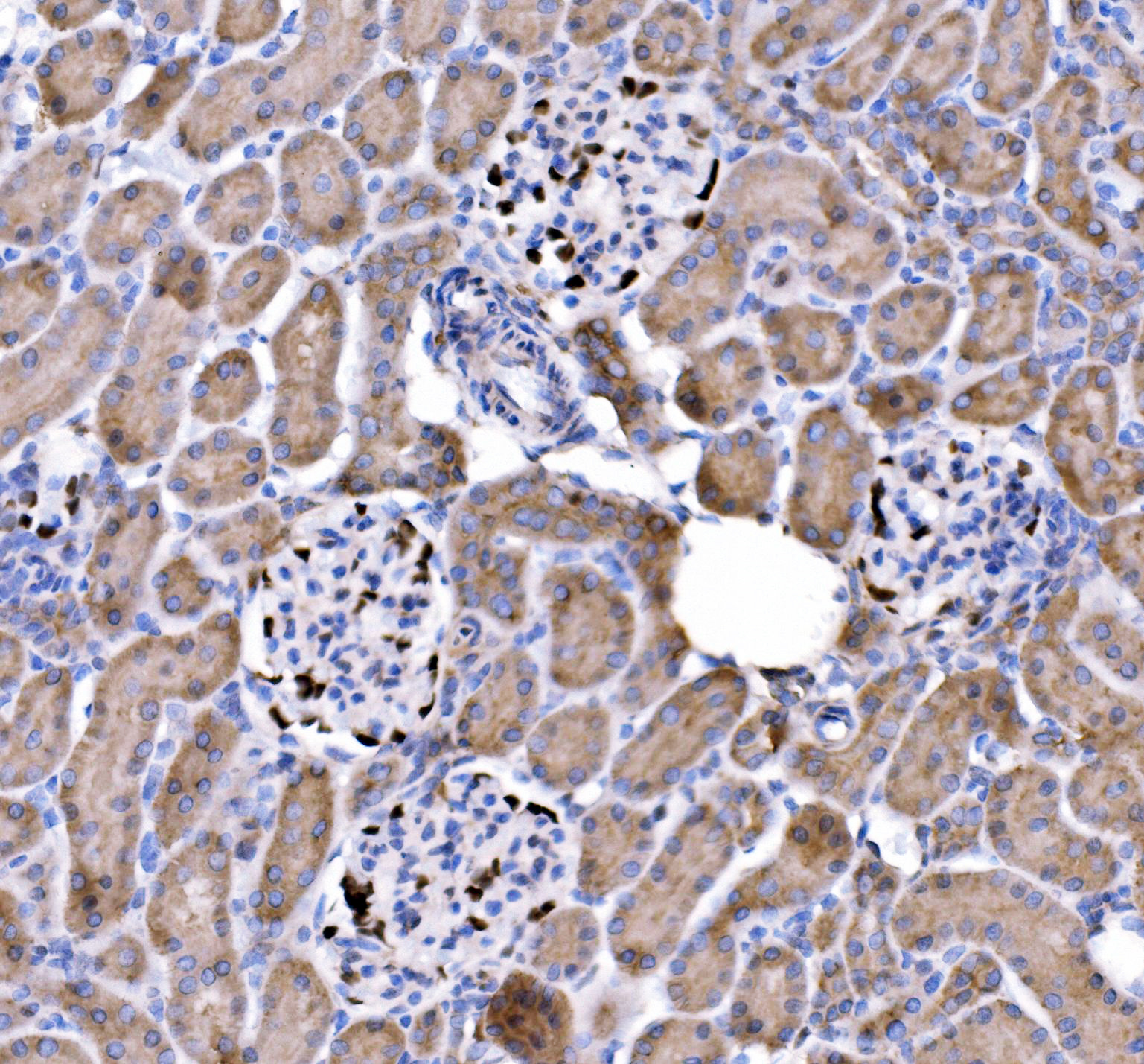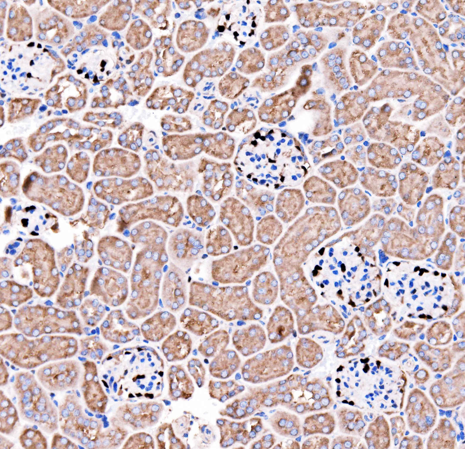 p57Kip2/CDKN1C was detected in a paraffin-embedded section of rat kidney tissue. Biotinylated goat anti-rabbit IgG was used as secondary antibody. The tissue section was incubated with rabbit anti-p57Kip2/CDKN1C Antibody (A01244-2) at a dilution of 1:200 and developed using Strepavidin-Biotin-Complex (SABC) (Catalog # SA1022) with DAB (Catalog # AR1027) as the chromogen.