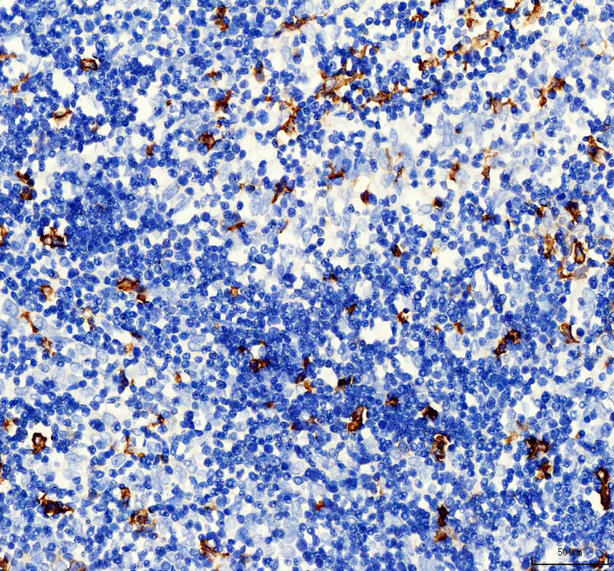 IBA1/AIF1 was detected in a paraffin-embedded section of human spleen tissue. The tissue section was incubated with rabbit anti-IBA1/AIF1 Antibody (A01394) at a dilution of 1:200 and developed using HRP Conjugated Rabbit IgG Super Vision Assay Kit (Catalog # SV0002) with DAB (Catalog # AR1027) as the chromogen.