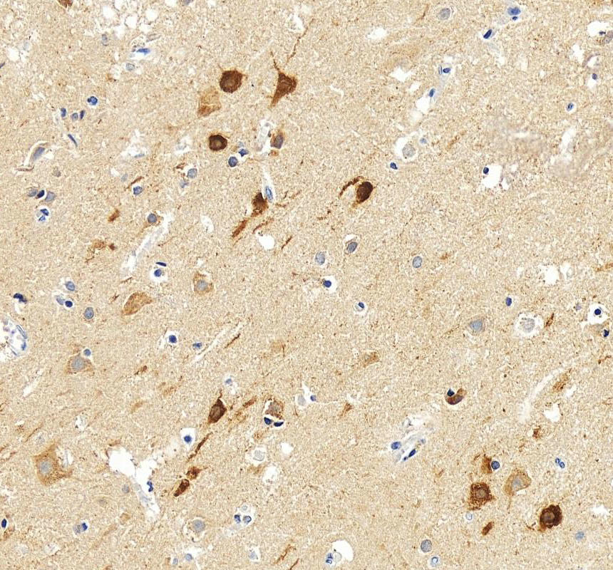 LC3A/MAP1LC3A was detected in a paraffin-embedded section of human brain tissue. The tissue section was incubated with rabbit anti-LC3A/MAP1LC3A Antibody (A01543-1) at a dilution of 1:200 and developed using HRP Conjugated Rabbit IgG Super Vision Assay Kit (Catalog # SV0002) with DAB (Catalog # AR1027) as the chromogen.