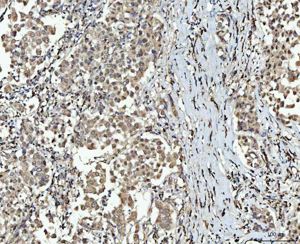 IHC analysis of SMC6 using anti-SMC6 antibody (A01554-2). SMC6 was detected in a paraffin-embedded section of human breast cancer tissue. Biotinylated goat anti-rabbit IgG was used as secondary antibody. The tissue section was developed using Strepavidin-Biotin-Complex (SABC) (Catalog # SA1022) with DAB (Catalog # AR1027) as the chromogen.