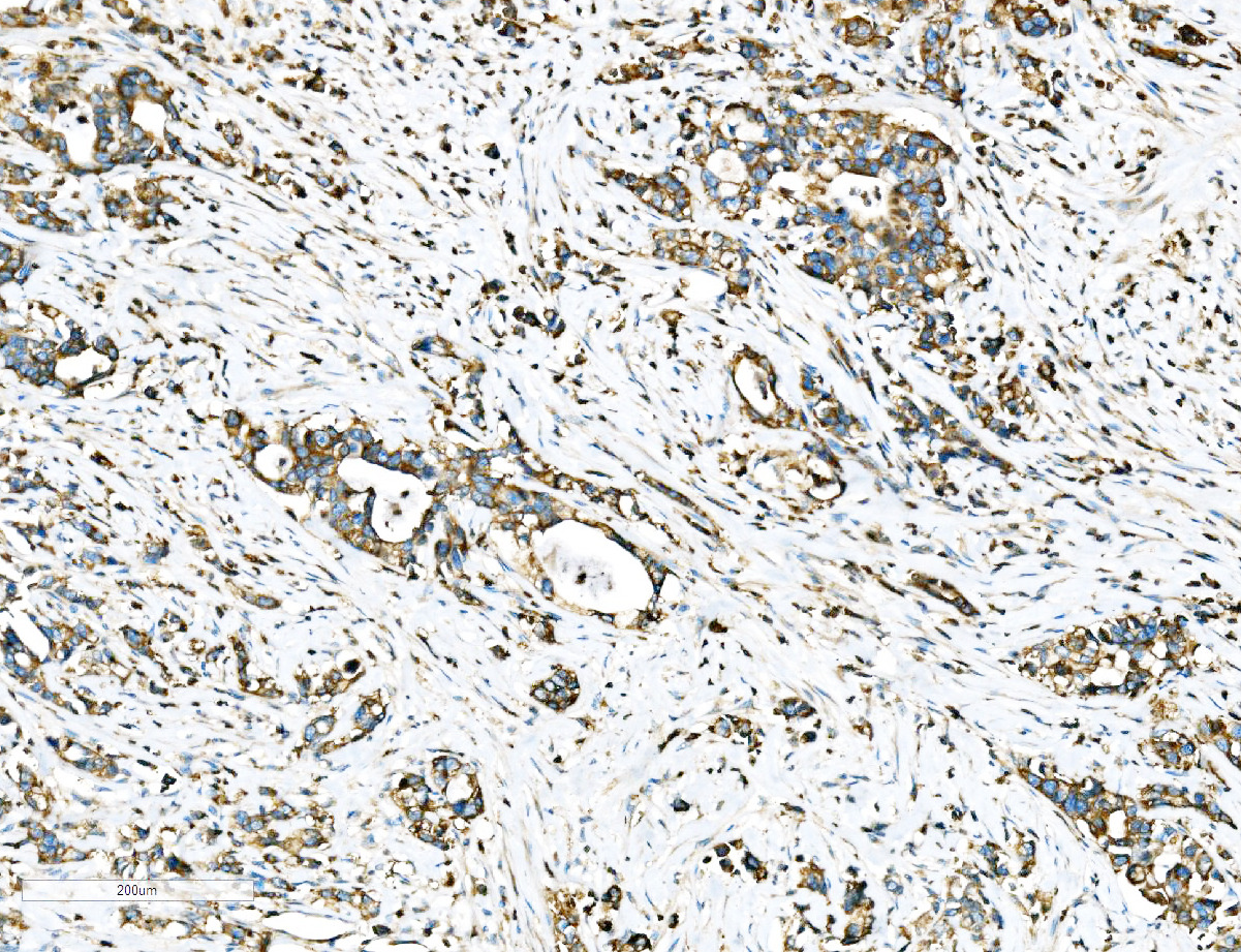 Ezrin/EZR was detected in a paraffin-embedded section of human gastric carcinoma tissue. Biotinylated goat anti-rabbit IgG was used as secondary antibody. The tissue section was incubated with rabbit anti-Ezrin/EZR Antibody (A01750-2) at a dilution of 1:200 and developed using Strepavidin-Biotin-Complex (SABC) (Catalog # SA1022) with DAB (Catalog # AR1027) as the chromogen.