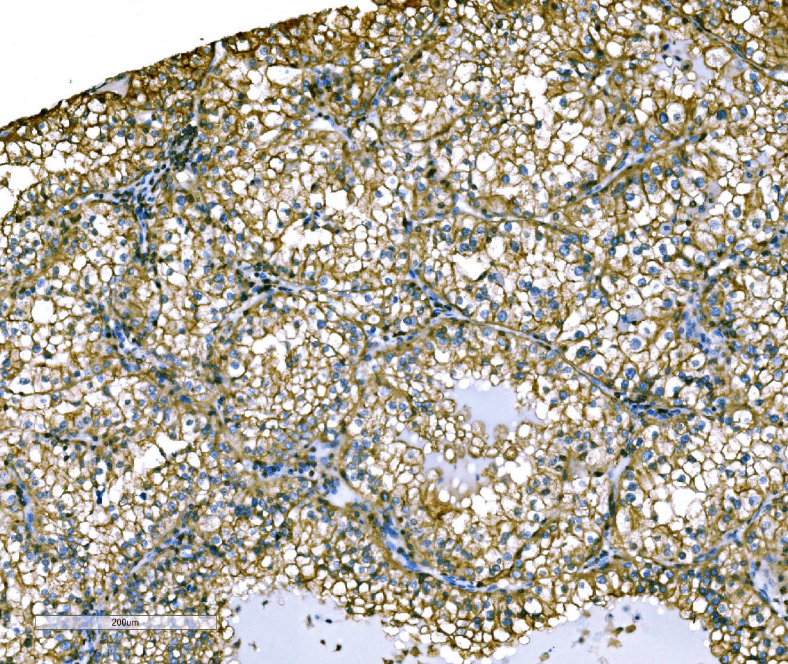 Ezrin/EZR was detected in a paraffin-embedded section of human renal cell carcinoma tissue. Biotinylated goat anti-rabbit IgG was used as secondary antibody. The tissue section was incubated with rabbit anti-Ezrin/EZR Antibody (A01750-2) at a dilution of 1:200 and developed using Strepavidin-Biotin-Complex (SABC) (Catalog # SA1022) with DAB (Catalog # AR1027) as the chromogen.