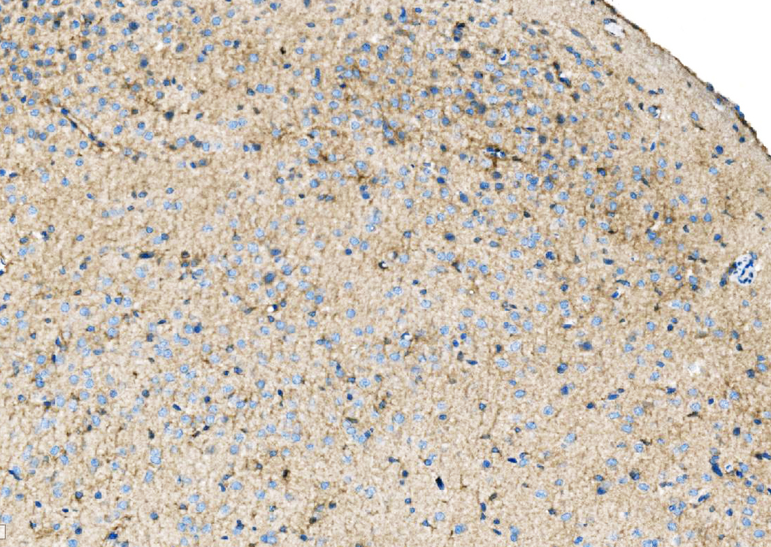 Ezrin/EZR was detected in a paraffin-embedded section of rat brain tissue. Biotinylated goat anti-rabbit IgG was used as secondary antibody. The tissue section was incubated with rabbit anti-Ezrin/EZR Antibody (A01750-2) at a dilution of 1:200 and developed using Strepavidin-Biotin-Complex (SABC) (Catalog # SA1022) with DAB (Catalog # AR1027) as the chromogen.