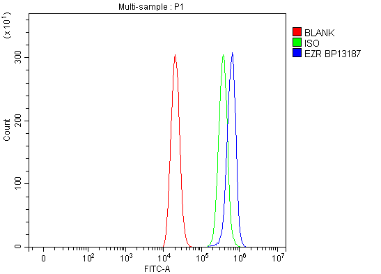 Overlay histogram showing THP-1 cells stained with A01750-2 (Blue line). To facilitate intracellular staining, cells were fixed with 4% paraformaldehyde and permeabilized with permeabilization buffer. The cells were blocked with 10% normal goat serum. And then incubated with rabbit anti-Ezrin/EZR Antibody (A01750-2) at 1:100 dilution for 30 min at 20°C. Fluoro488 conjugated goat anti-rabbit IgG (BA1127) was used as secondary antibody at 1:100 dilution for 30 minutes at 20°C. Isotype control antibody (Green line) was rabbit IgG at 1:100 dilution used under the same conditions. Unlabelled sample without incubation with primary antibody and secondary antibody (Red line) was used as a blank control.