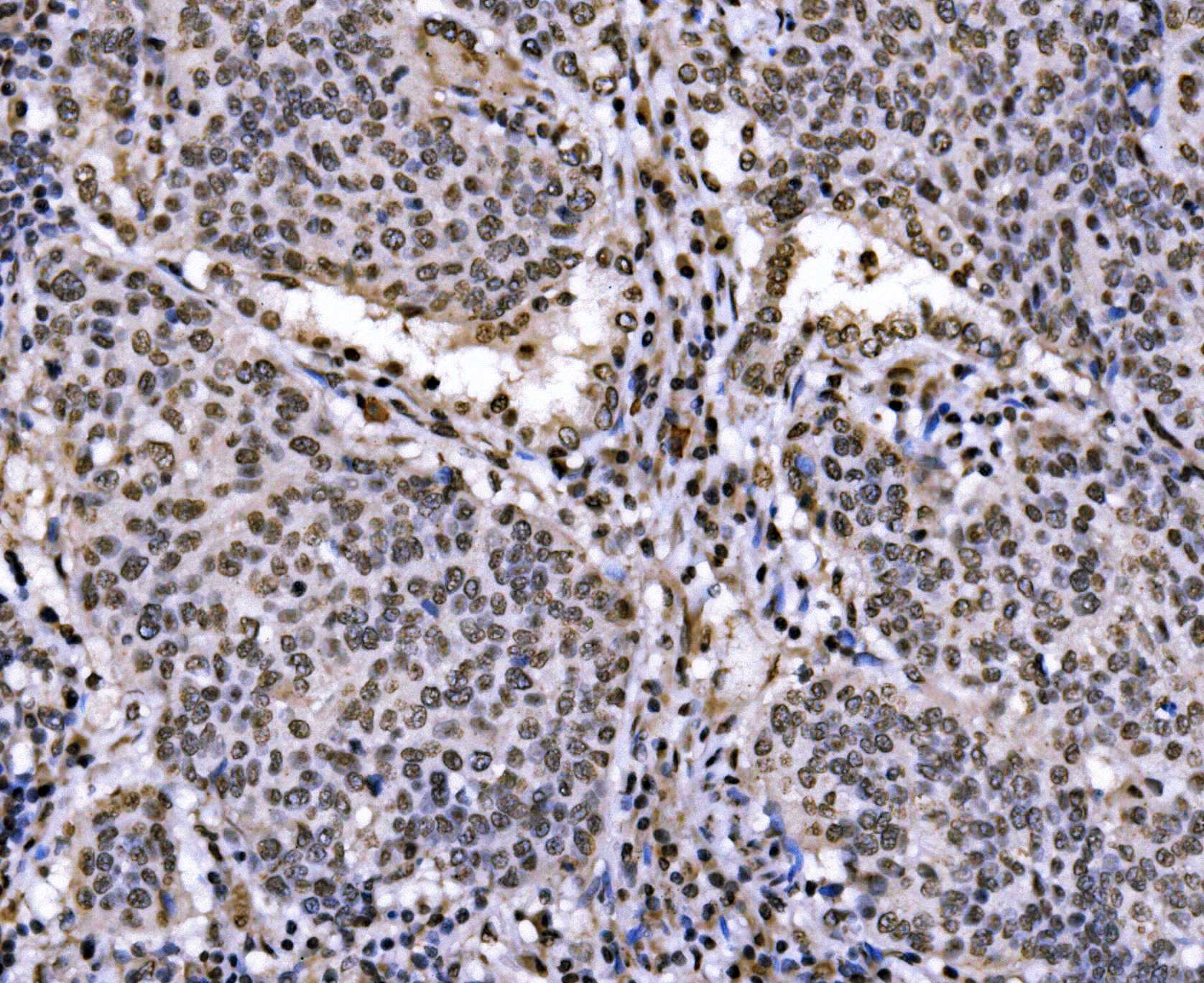 c-Jun/JUN was detected in a paraffin-embedded section of human lung cancer tissue. Biotinylated goat anti-rabbit IgG was used as secondary antibody. The tissue section was incubated with rabbit anti-c-Jun/JUN Antibody (A02038-2) at a dilution of 1:200 and developed using Strepavidin-Biotin-Complex (SABC) (Catalog # SA1022) with DAB (Catalog # AR1027) as the chromogen.