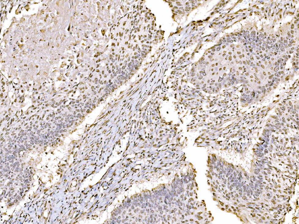 c-Jun/JUN was detected in a paraffin-embedded section of human Laryngeal squamous cell carcinoma tissue. Biotinylated goat anti-rabbit IgG was used as secondary antibody. The tissue section was incubated with rabbit anti-c-Jun/JUN Antibody (A02038-2) at a dilution of 1:200 and developed using Strepavidin-Biotin-Complex (SABC) (Catalog # SA1022) with DAB (Catalog # AR1027) as the chromogen.
