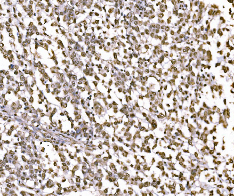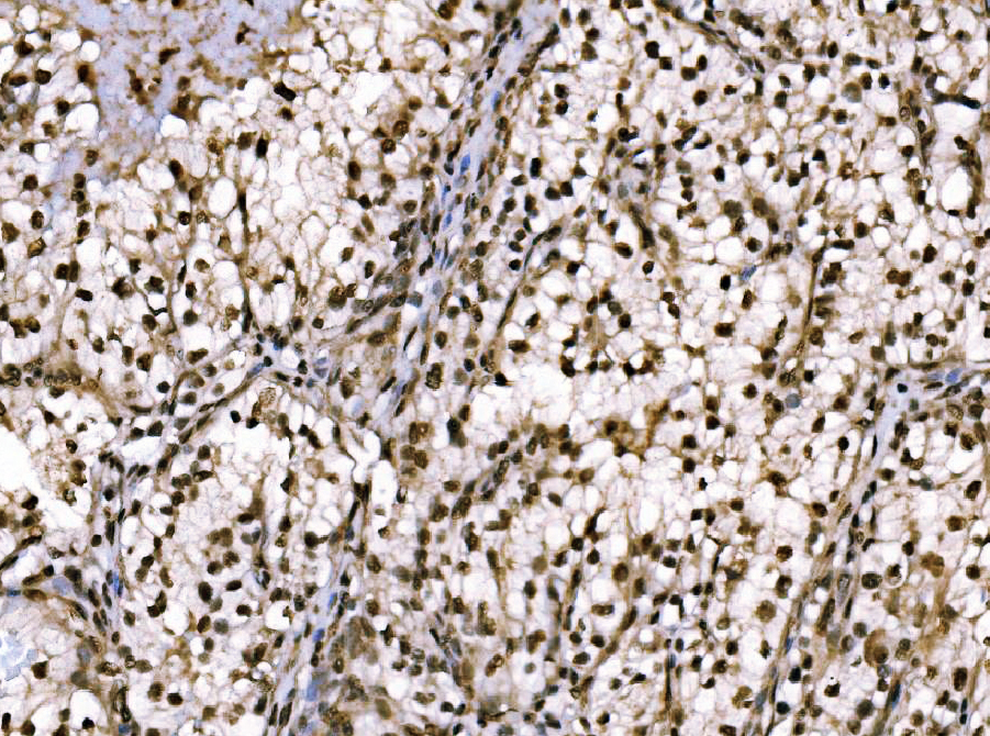 c-Jun/JUN was detected in a paraffin-embedded section of human renal clear cell carcinoma tissue. Biotinylated goat anti-rabbit IgG was used as secondary antibody. The tissue section was incubated with rabbit anti-c-Jun/JUN Antibody (A02038-2) at a dilution of 1:200 and developed using Strepavidin-Biotin-Complex (SABC) (Catalog # SA1022) with DAB (Catalog # AR1027) as the chromogen.