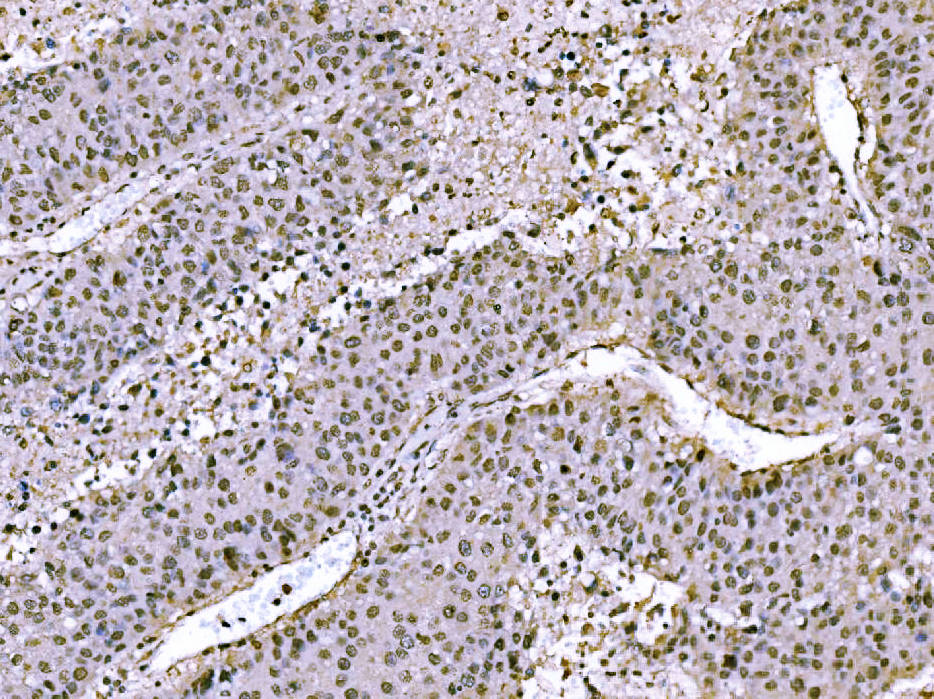 c-Jun/JUN was detected in a paraffin-embedded section of human liver cancer tissue. Biotinylated goat anti-rabbit IgG was used as secondary antibody. The tissue section was incubated with rabbit anti-c-Jun/JUN Antibody (A02038-2) at a dilution of 1:200 and developed using Strepavidin-Biotin-Complex (SABC) (Catalog # SA1022) with DAB (Catalog # AR1027) as the chromogen.