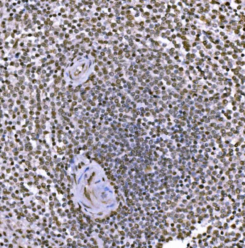 c-Jun/JUN was detected in a paraffin-embedded section of human spleen tissue. Biotinylated goat anti-rabbit IgG was used as secondary antibody. The tissue section was incubated with rabbit anti-c-Jun/JUN Antibody (A02038-2) at a dilution of 1:200 and developed using Strepavidin-Biotin-Complex (SABC) (Catalog # SA1022) with DAB (Catalog # AR1027) as the chromogen.