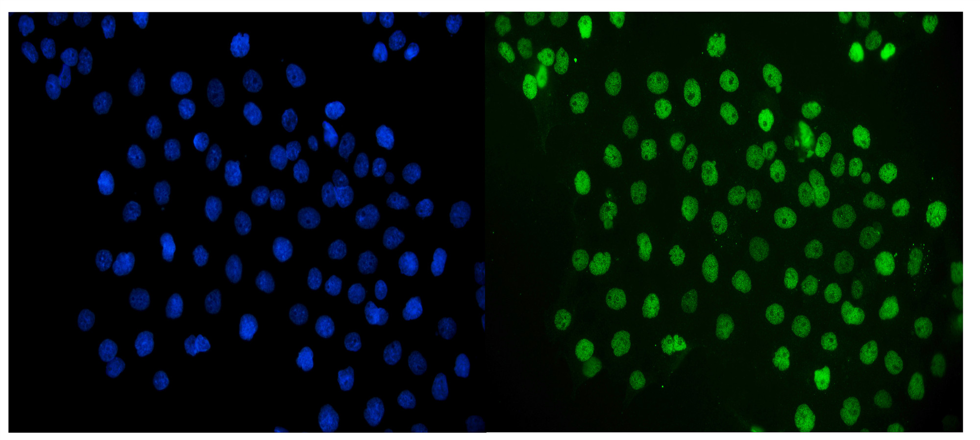 c-Jun/JUN was detected in an immunocytochemical section of A431 cells. The section was incubated with rabbit anti-c-Jun/JUN Antibody (A02038-2) at a dilution of 1:100. Fluoro488 Conjugated Goat Anti-Rabbit IgG (Green) (Catalog # BA1127) was used as secondary antibody. The section was counterstained with DAPI (Catalog # AR1176) (Blue).