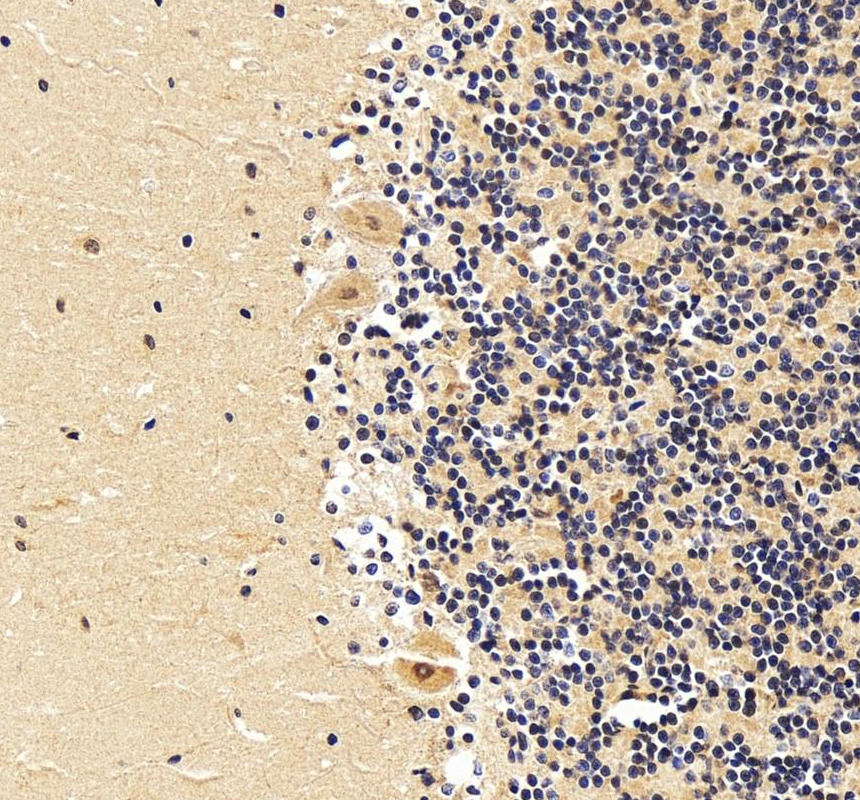 c-Jun/JUN was detected in a paraffin-embedded section of human cerebellum tissue. The tissue section was incubated with rabbit anti-c-Jun/JUN Antibody (A02038-2) at a dilution of 1:200 and developed using HRP Conjugated Rabbit IgG Super Vision Assay Kit (Catalog # SV0002) with DAB (Catalog # AR1027) as the chromogen.