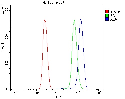 Overlay histogram showing U937 cells stained with A02128 (Blue line). The cells were fixed with 4% paraformaldehyde and blocked with 10% normal goat serum. And then incubated with rabbit anti-PSD95/DLG4 Antibody (A02128) at 1:100 dilution for 30 min at 20°C. Fluoro488 conjugated goat anti-rabbit IgG (BA1127) was used as secondary antibody at 1:100 dilution for 30 minutes at 20°C. Isotype control antibody (Green line) was rabbit IgG at 1:100 dilution used under the same conditions. Unlabelled sample without incubation with primary antibody and secondary antibody (Red line) was used as a blank control.