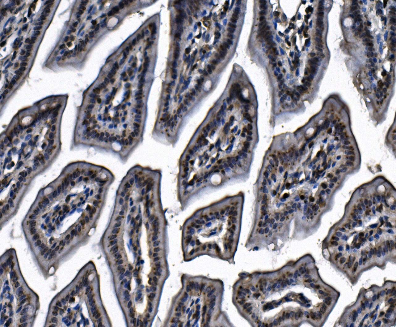 MCM4 was detected in a paraffin-embedded section of mouse colon tissue. Biotinylated goat anti-rabbit IgG was used as secondary antibody. The tissue section was incubated with rabbit anti-MCM4 Antibody (A02301-1) at a dilution of 1:200 and developed using Strepavidin-Biotin-Complex (SABC) (Catalog # SA1022) with DAB (Catalog # AR1027) as the chromogen.
