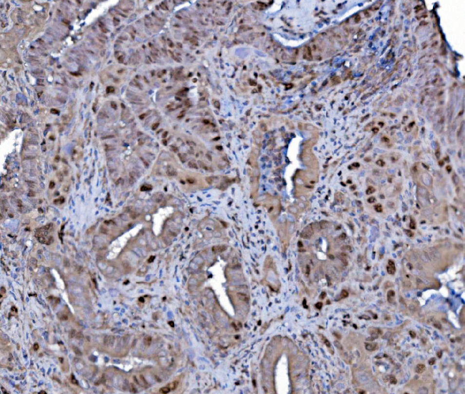 MCM4 was detected in a paraffin-embedded section of human rectal cancer tissue. Biotinylated goat anti-rabbit IgG was used as secondary antibody. The tissue section was incubated with rabbit anti-MCM4 Antibody (A02301-1) at a dilution of 1:200 and developed using Strepavidin-Biotin-Complex (SABC) (Catalog # SA1022) with DAB (Catalog # AR1027) as the chromogen.