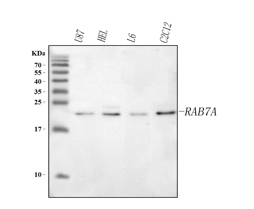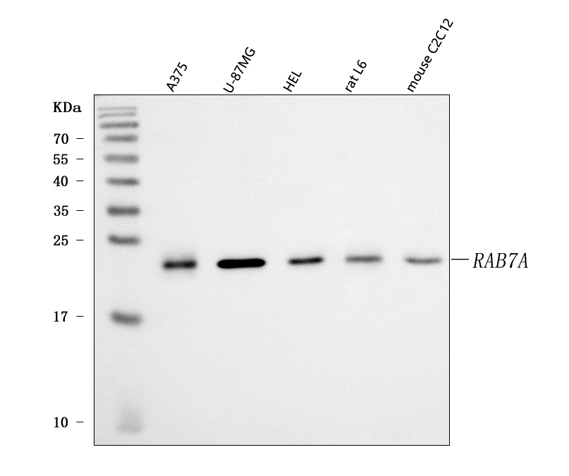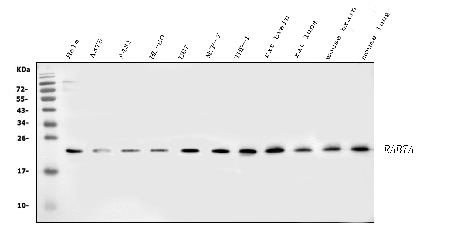 Western blot analysis of anti- RAB7/RAB7A antibody (A02409-1). The sample well of each lane was loaded with 30ug of sample under reducing conditions.
