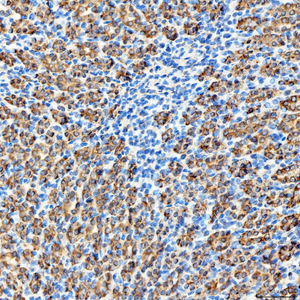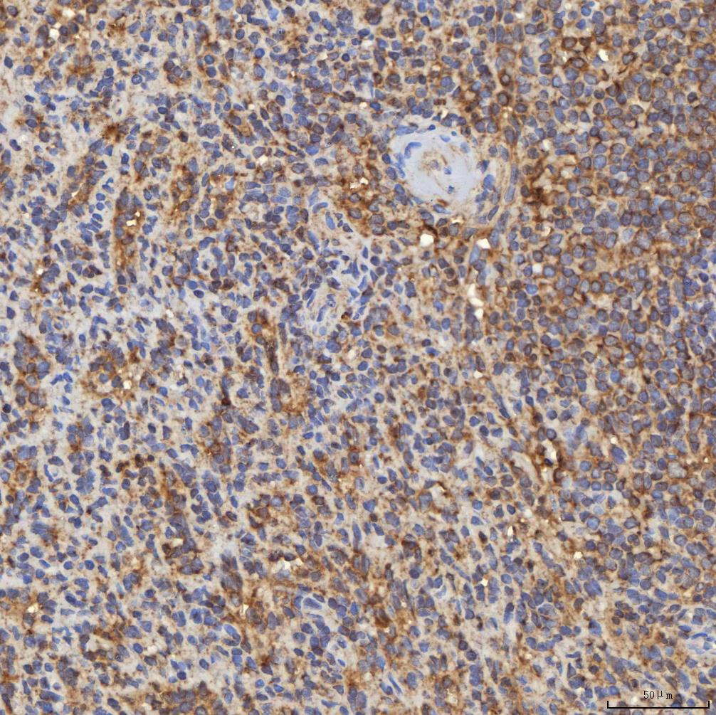 RAB7A was detected in a paraffin-embedded section of human diffuse large B cell lymphoma tissue. The tissue section was incubated with rabbit anti-RAB7A Antibody (A02409-1) at a dilution of 1:200 and developed using HRP Conjugated Rabbit IgG Super Vision Assay Kit (Catalog # SV0002) with DAB (Catalog # AR1027) as the chromogen.