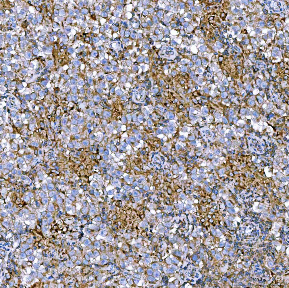 RAB7A was detected in a paraffin-embedded section of human testicular seminoma tissue. The tissue section was incubated with rabbit anti-RAB7A Antibody (A02409-1) at a dilution of 1:200 and developed using HRP Conjugated Rabbit IgG Super Vision Assay Kit (Catalog # SV0002) with DAB (Catalog # AR1027) as the chromogen.